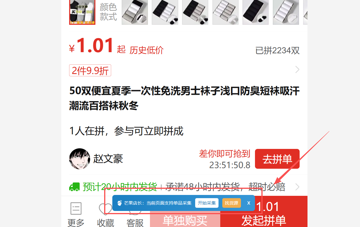 2、打开拼多多采集页面:http://app.yangkeduo.com/ 找一个产品点击进入后,点“开始采集”(记得要登录芒果店长哦)