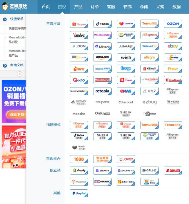 第二步:平台授权,绑定店铺(关键一步)。在芒果店长后台找到“平台授权”,选择运营平台(美客多、Shopee等)完成对接,绑定后订单、库存自动同步,不用手动导入。